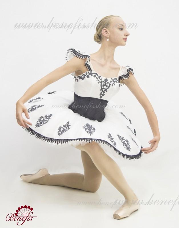 This is a professional stage ballet costume that can be used for many classical roles, such as Paquita, Grand Pas Classique, etc. The white and black bodice fastens at the back with two rows of hooks. In the chest area, the bodice is fastened with an inner cord in the chest area. White and black decorated cap sleeves. The top part of the bodice is embellished with elegant black appliques. The white, professional tutu skirt is made of light soft and hard tulle. Black appliques and lace braids are used as decoration.