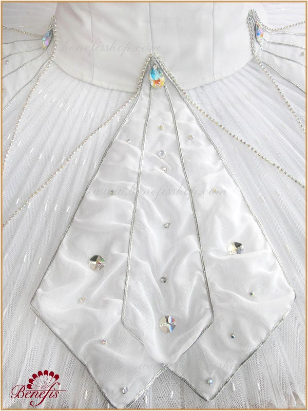 La couche supérieure de la jupe est décorée d'appliqués de crêpe-mousseline en forme de losanges oblongs. La jupe est ornée de cristaux et de clairons.