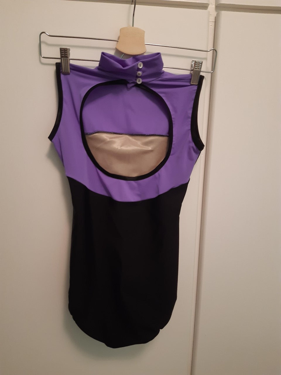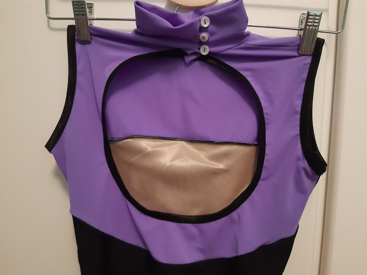 Ce justaucorps sans manches, tout simplement chic, présente une coupe col montant et présente deux couleurs : une charmante nuance de lilas pour la partie supérieure et du noir.
