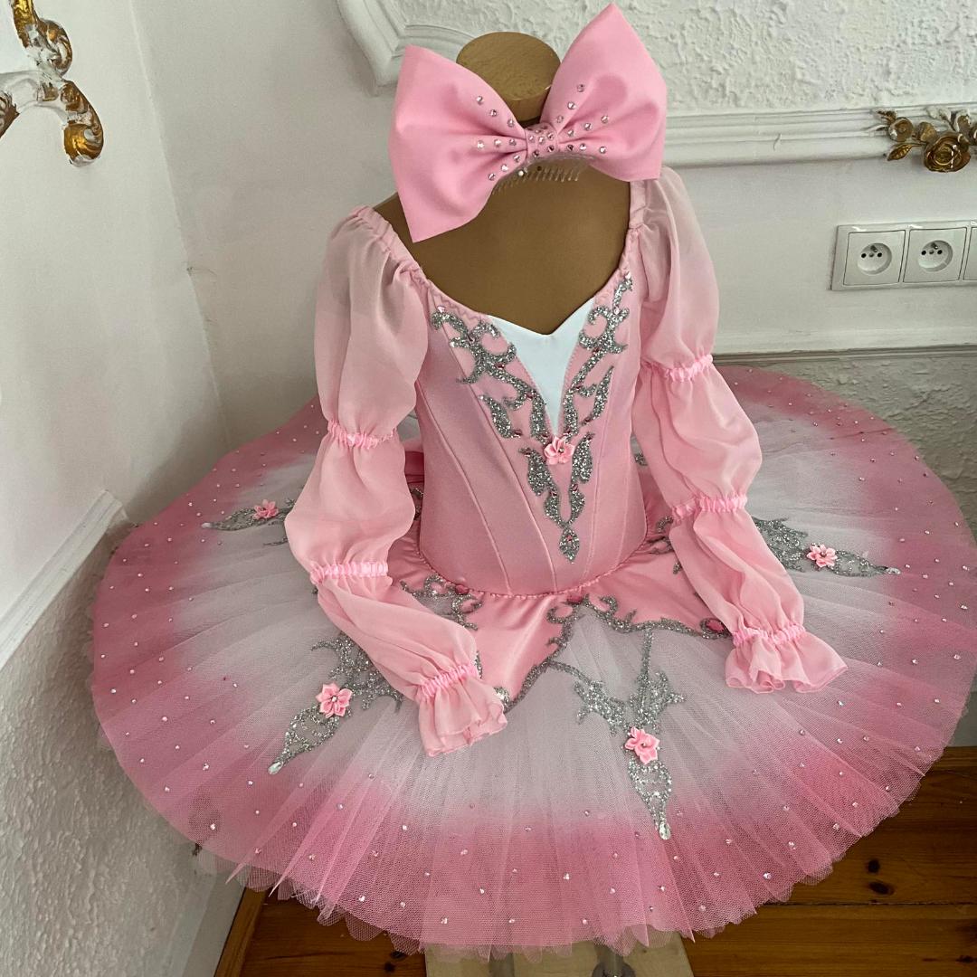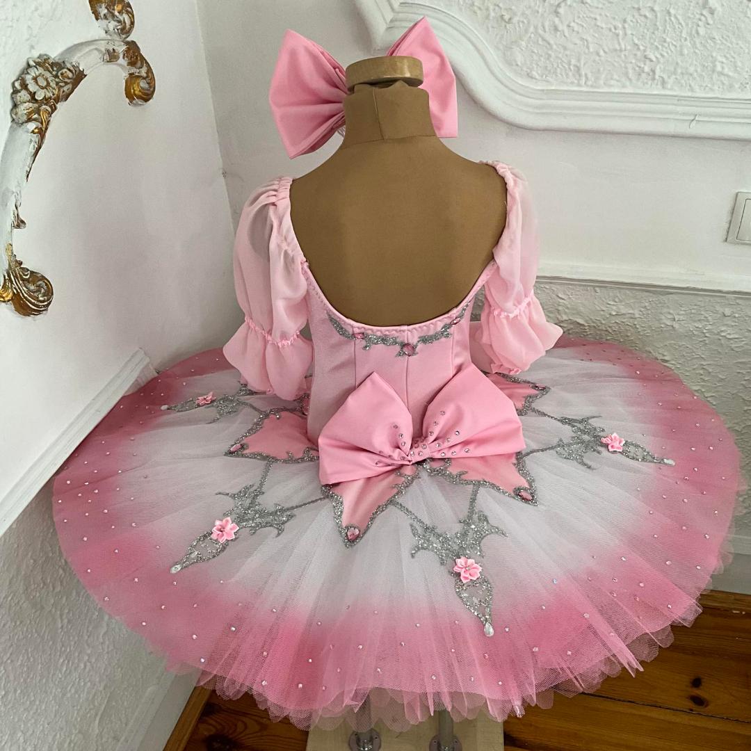 The professional, platter tutu skirt has been ombre' dyed, showing white tulle towards the top part, and pink edges. The tutu skirt is also decorated with silver appliques, pink flowers and crystals. A big pink bow is sewed to the back of the costume.