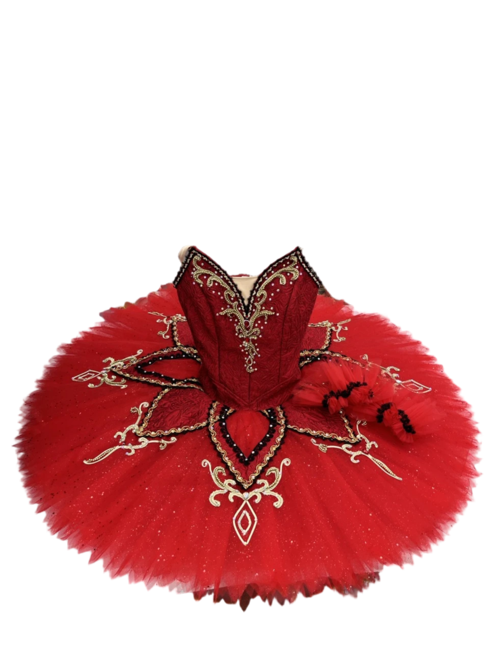 La jupe rouge foncé professionnelle à 10 couches a une petite superposition en forme de fleur et est ornée de bordures dorées, d'appliques et de paillettes.