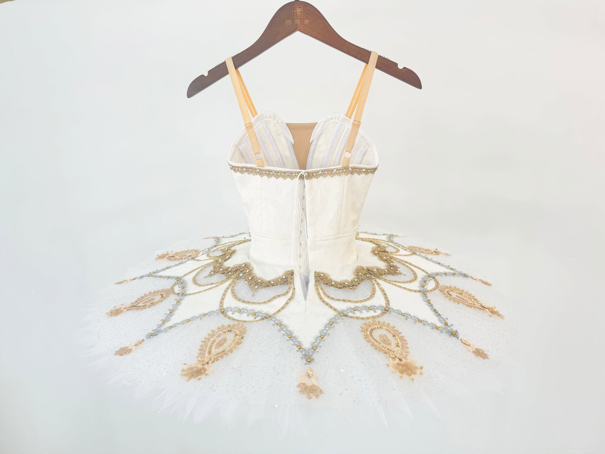 Féminin, envoûtant.... est un triomphe du blanc et de l'or... toute danseuse portant ce costume ressemblera à une vraie princesse.