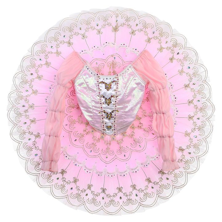 New creation for the roe of Princess Aurora. This professional pancake, pink tutu features a pale pink, satin bodice with rich decoration, and fastening in the back with a double row of hooks and eyes. Long pink sleeves add a touch of elegance to this tutu.