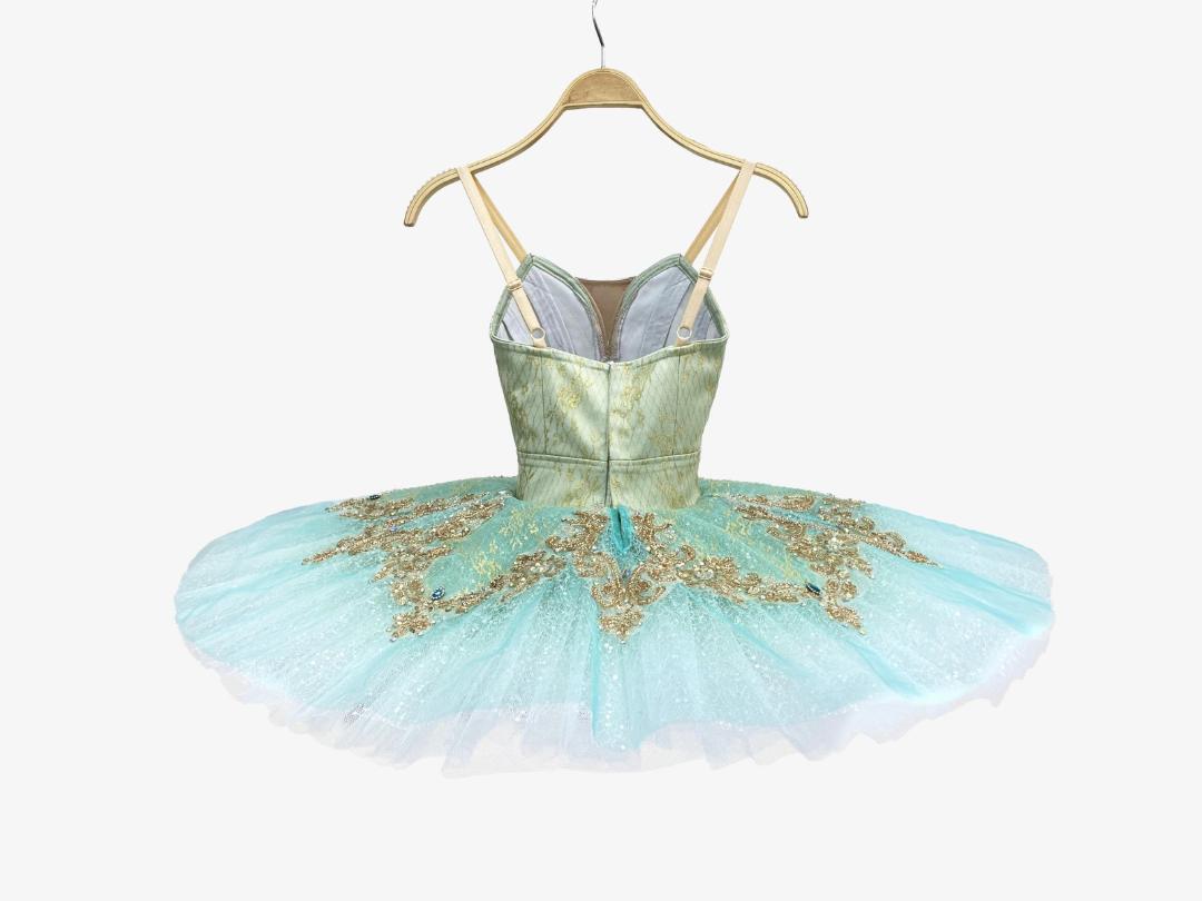 Un véritable costume de princesse comprenant une jupe tutu blanche à plateau, avec une couche supérieure en tulle pailleté vert aqua et un corsage en brocart assorti. Le corsage est orné d'appliques dorées et de strass. Fermeture par crochets et yeux dans le dos.