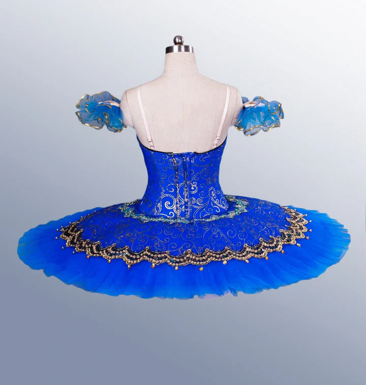 Le plateau professionnel, la jupe à 10 couches comporte une petite superposition bleue et dorée. La décoration a été réalisée avec toutes sortes de garnitures et de paillettes dorées et bleues.