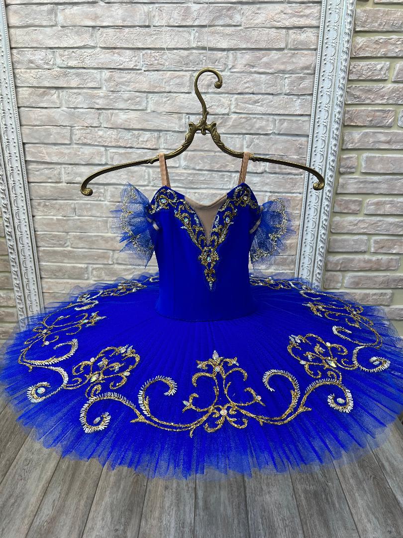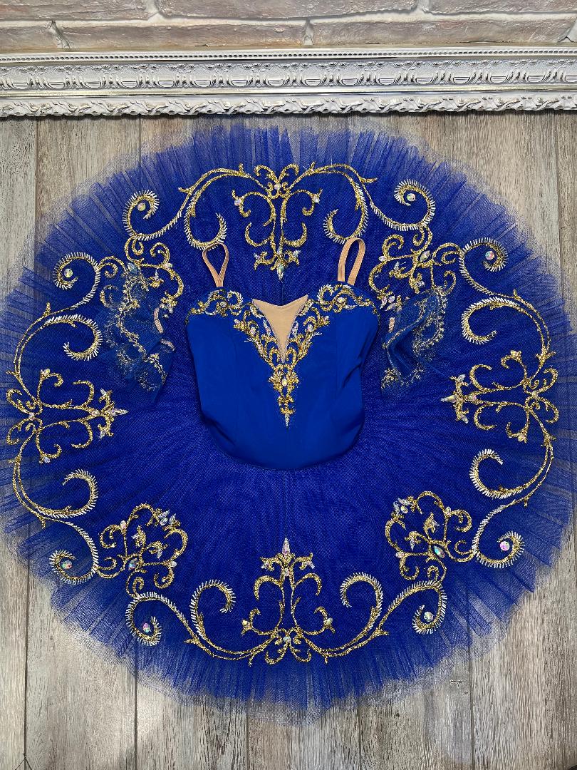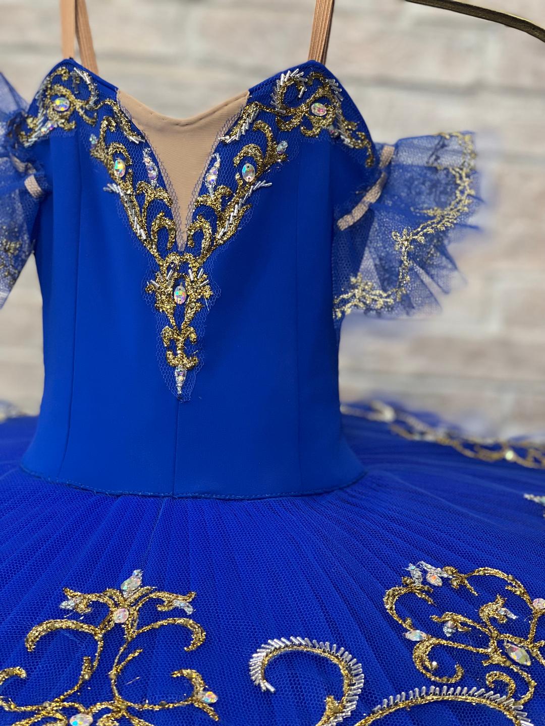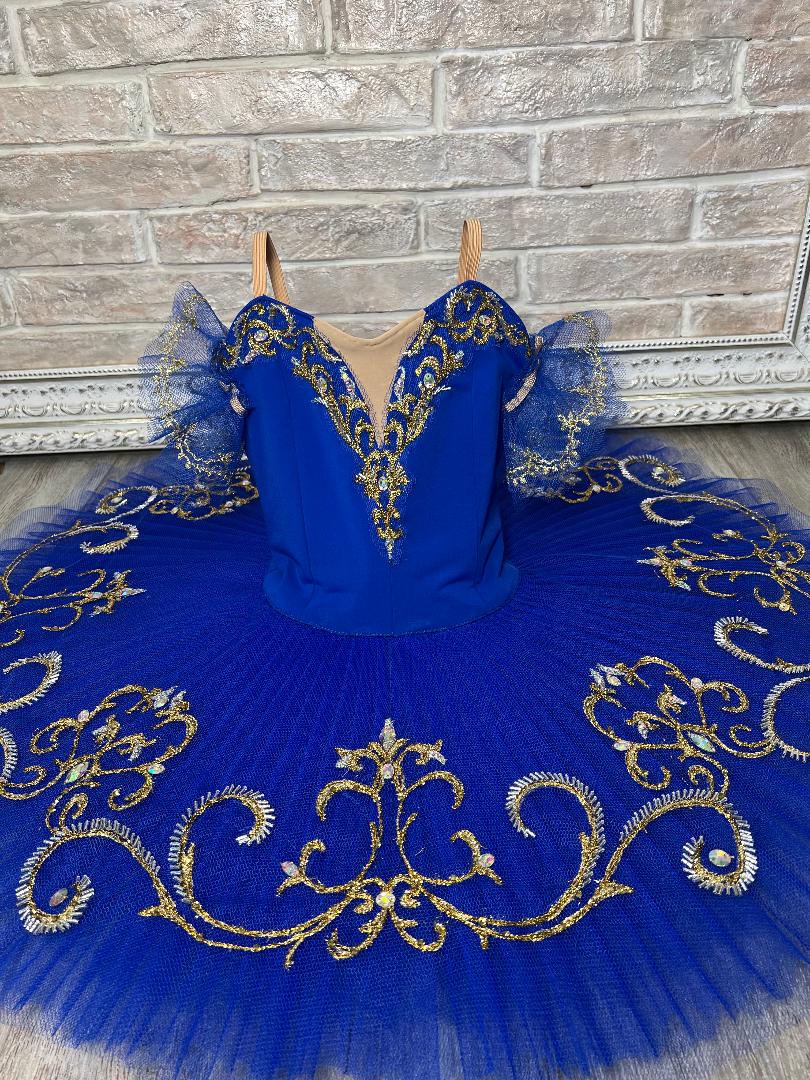 Ce superbe tutu russe professionnel, l'un des meilleurs de notre collection, peut être utilisé pour le rôle de "Raymonda", "Medora" dans "Le Corsaire" et dans de nombreuses autres variations classiques. Le corsage, réalisé en tissu semi-extensible bleu profond, est orné d'appliques dorées et argentées, ainsi que de cristaux. Une double rangée de crochets et d'oeillets à l'arrière du costume assure un ajustement parfait. Les dix couches de la jupe bleue assortie sont fabriquées avec un filet de la plus haute qualité et toutes les couches sont étroitement collées ensemble afin qu'elles ne fassent qu'un avec le danseur. Le cerceau est inséré. Une riche décoration dorée sur la jupe du tutu complète le look de ce superbe tutu.