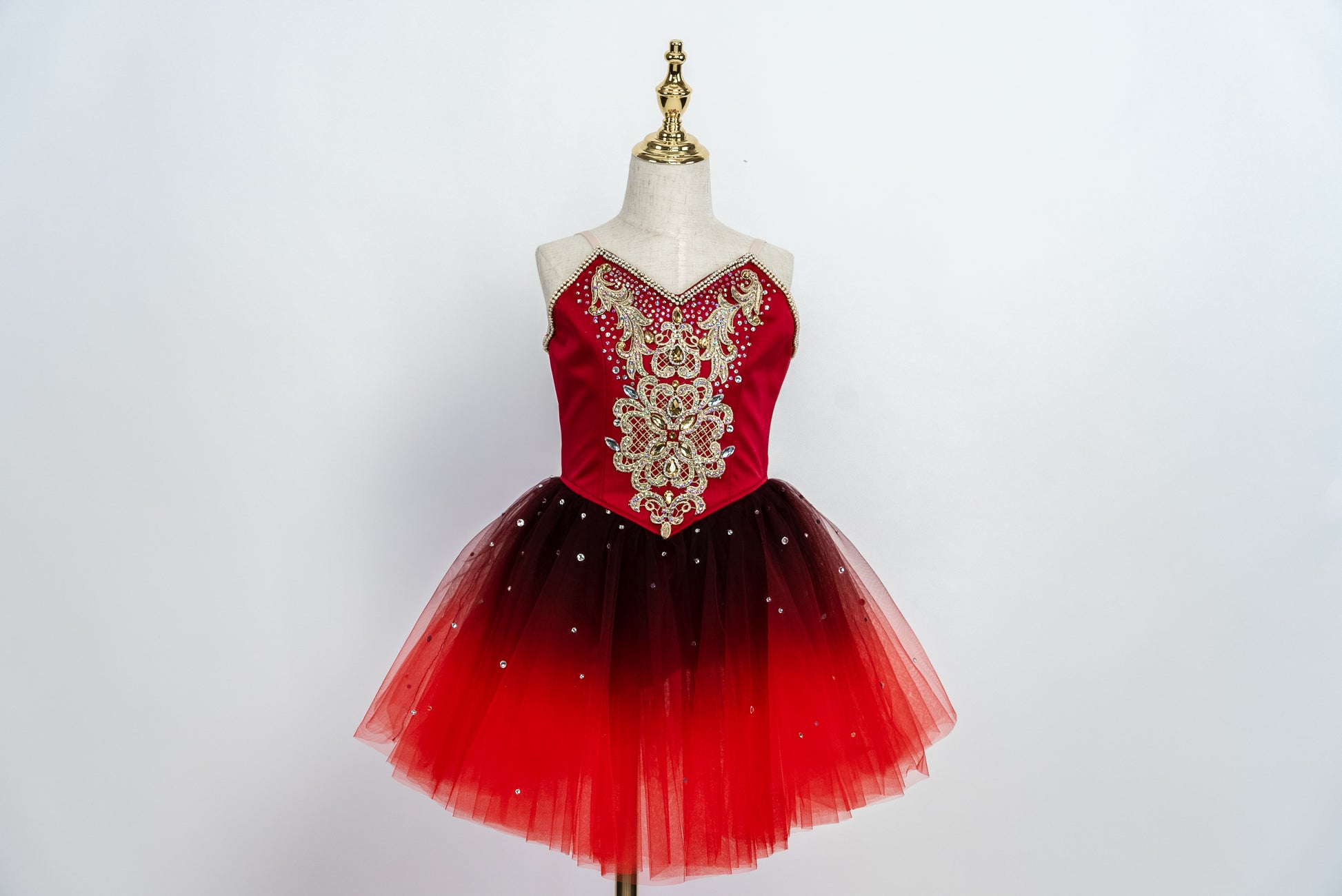 La jupe tutu rouge, jusqu'aux genoux, a été teinte à la main en noir et rouge, créant un beau contraste. Les paillettes cousues sur la jupe la rendent très brillante sous les lumières de la scène.