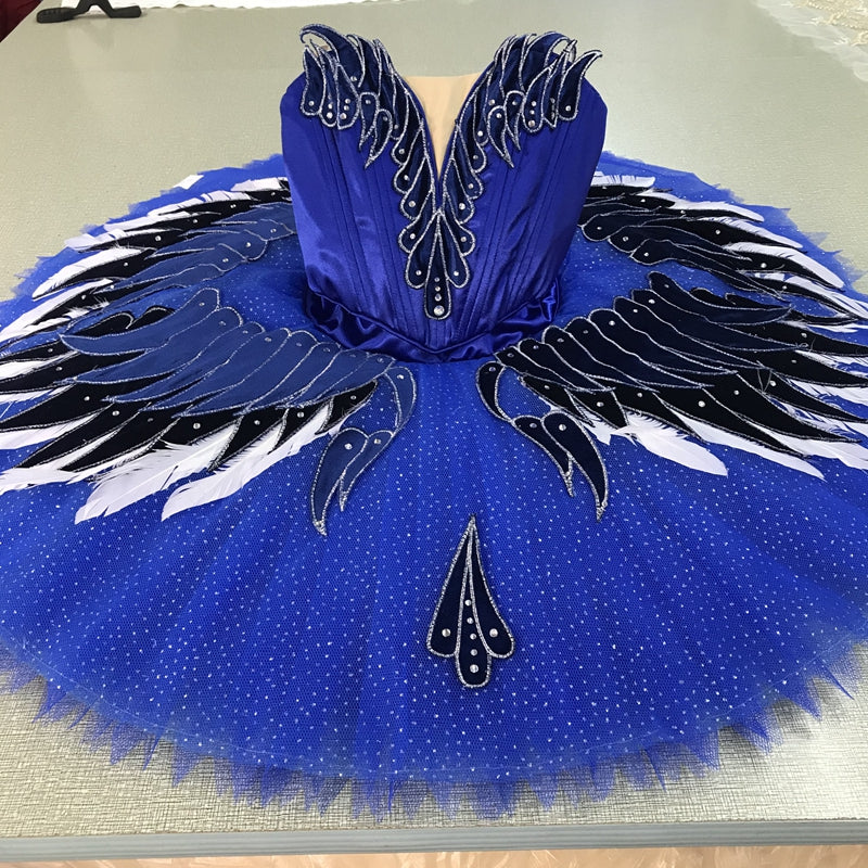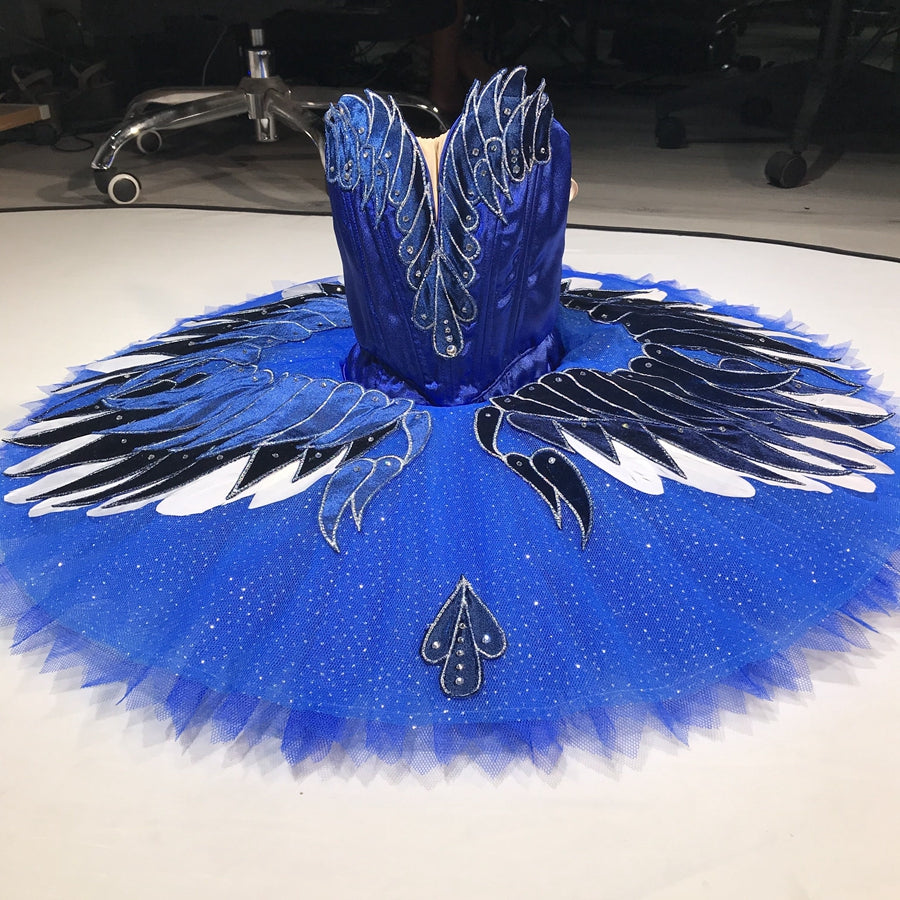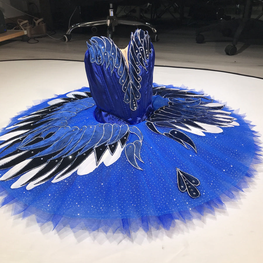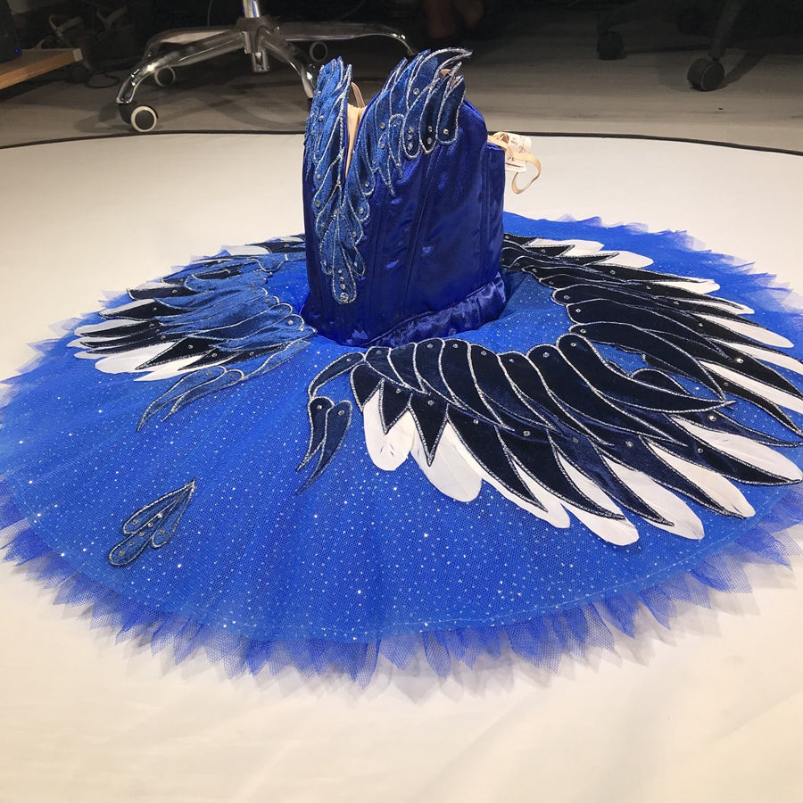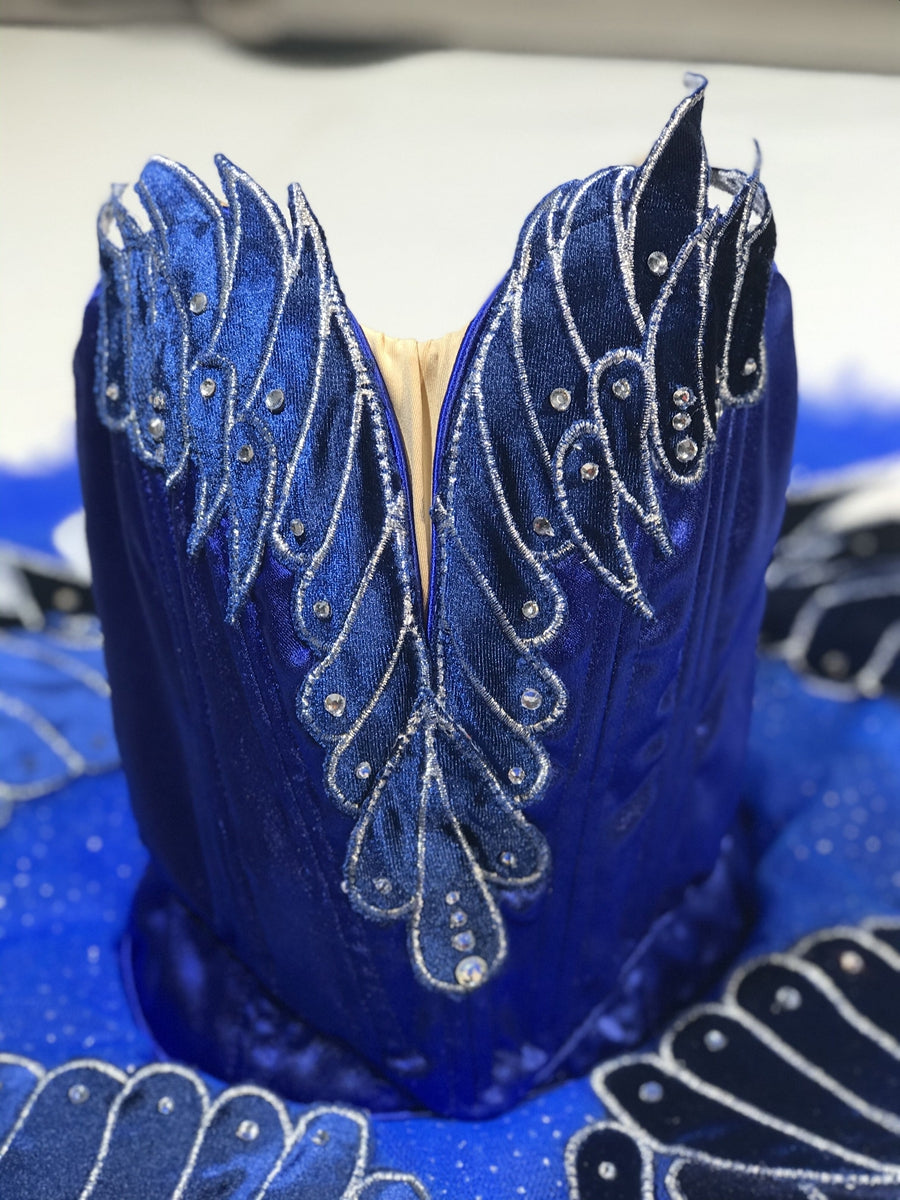 Corsage en satin en forme de V avec de riches applications bleues, reproduisant la forme des ailes d'un oiseau. La jupe tutu professionnelle bleue présente des paillettes sur la couche supérieure, ainsi qu'un motif complet de plumes d'oiseaux en blanc, noir et bleu foncé, enrichi de paillettes et de cristaux.