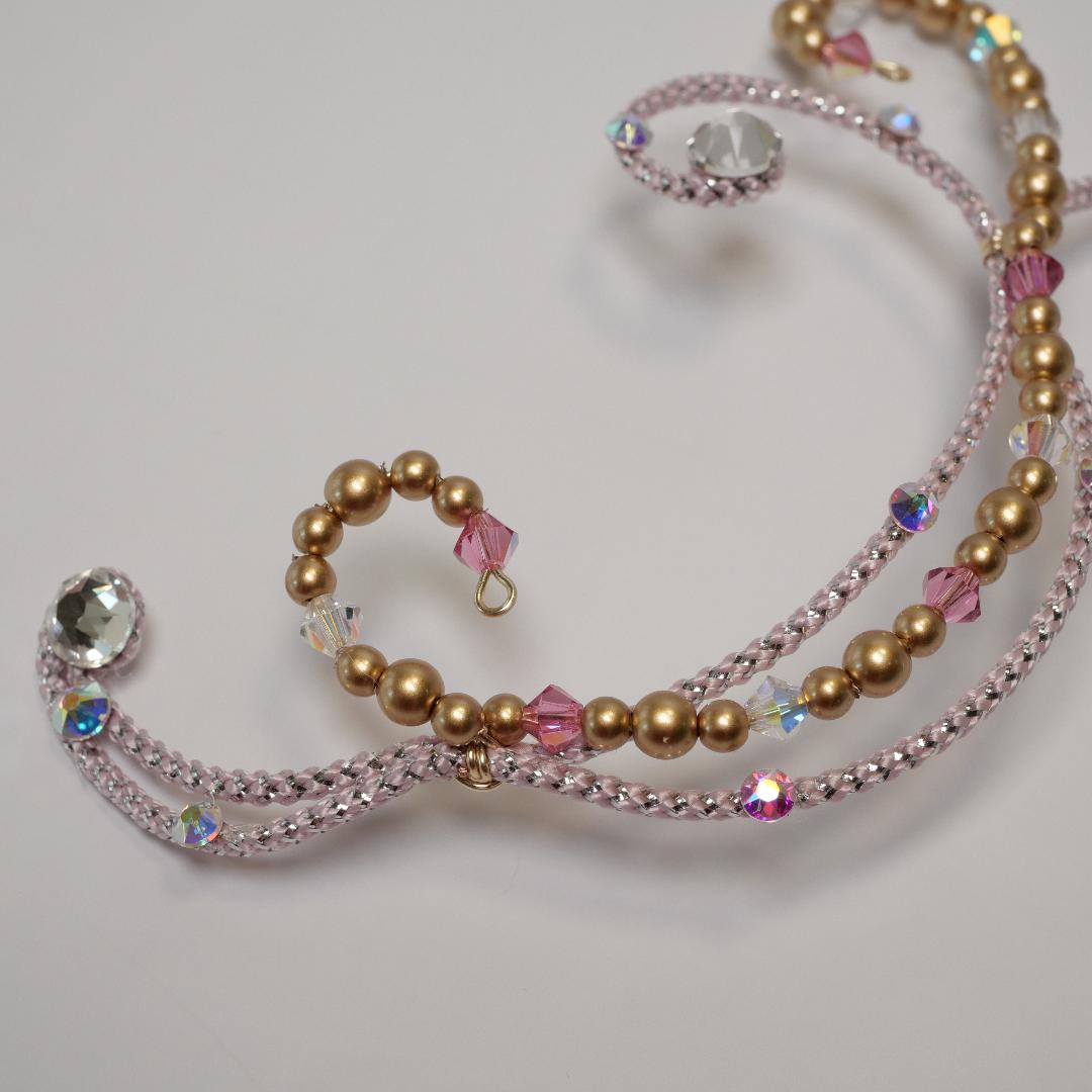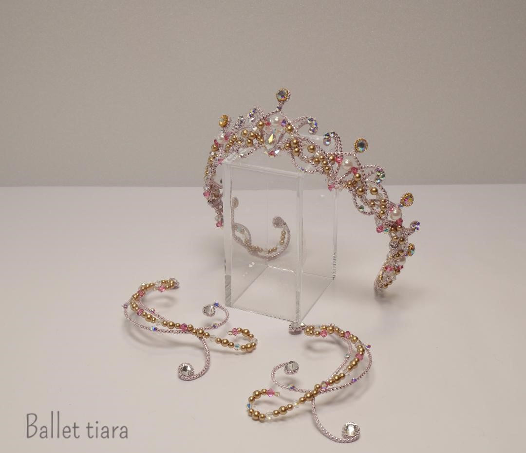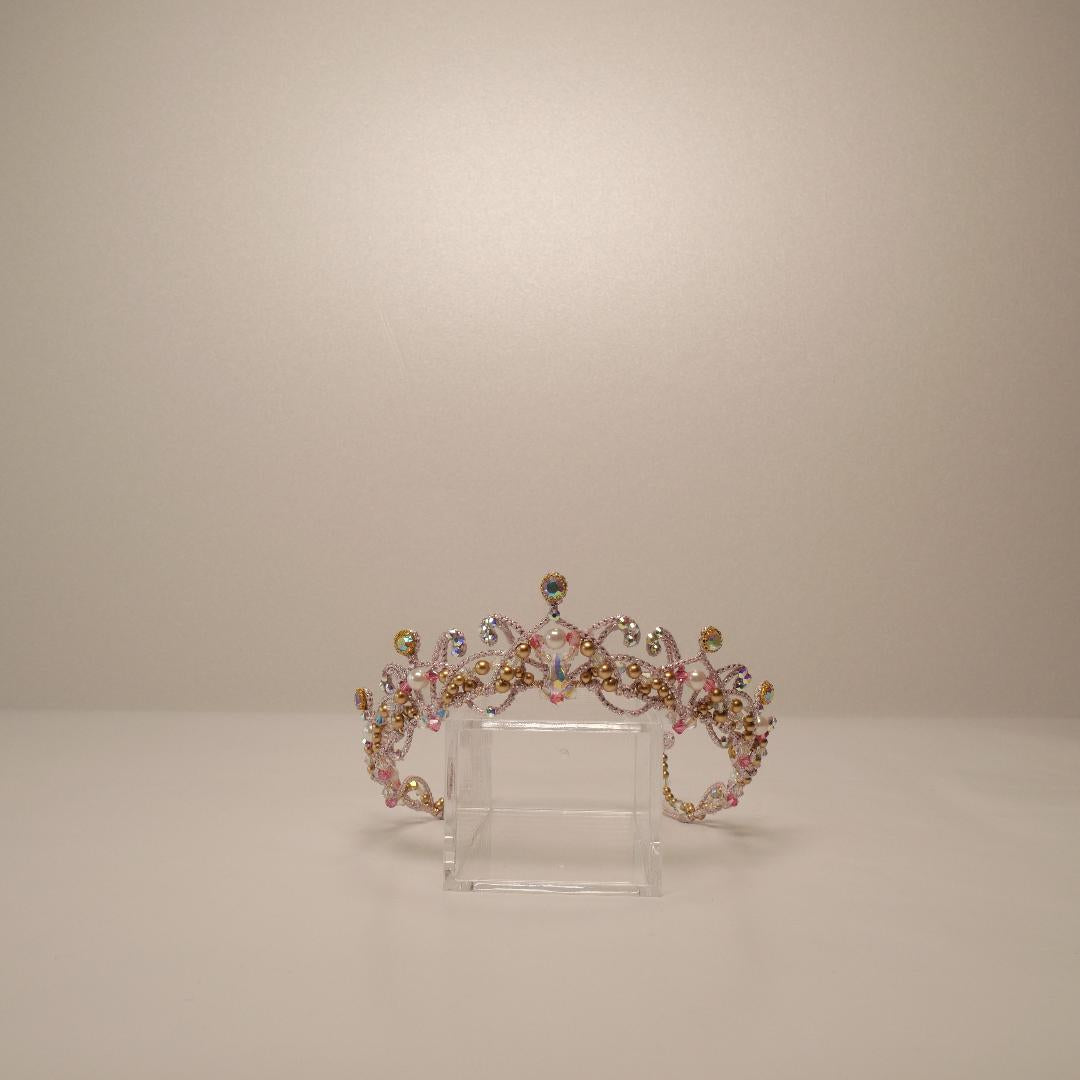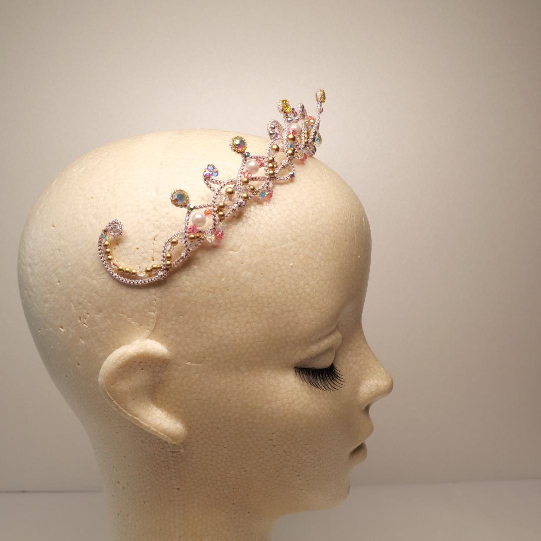 Un impressionnant diadème entièrement réalisé à la main avec des cristaux lilas et roses et des perles d'argent. Ce diadème décore toute la tête, puisqu'il fait le tour du chignon de la ballerine. Une chute spectaculaire sur le devant complète le look de cet incroyable accessoire pour cheveux.