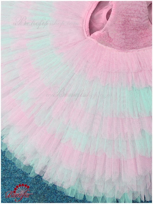 Le corsage et le couvercle s'accordent joliment avec le fond plus clair de la jupe tutu dont les couches de tulle alternent progressivement entre deux couleurs contrastées.