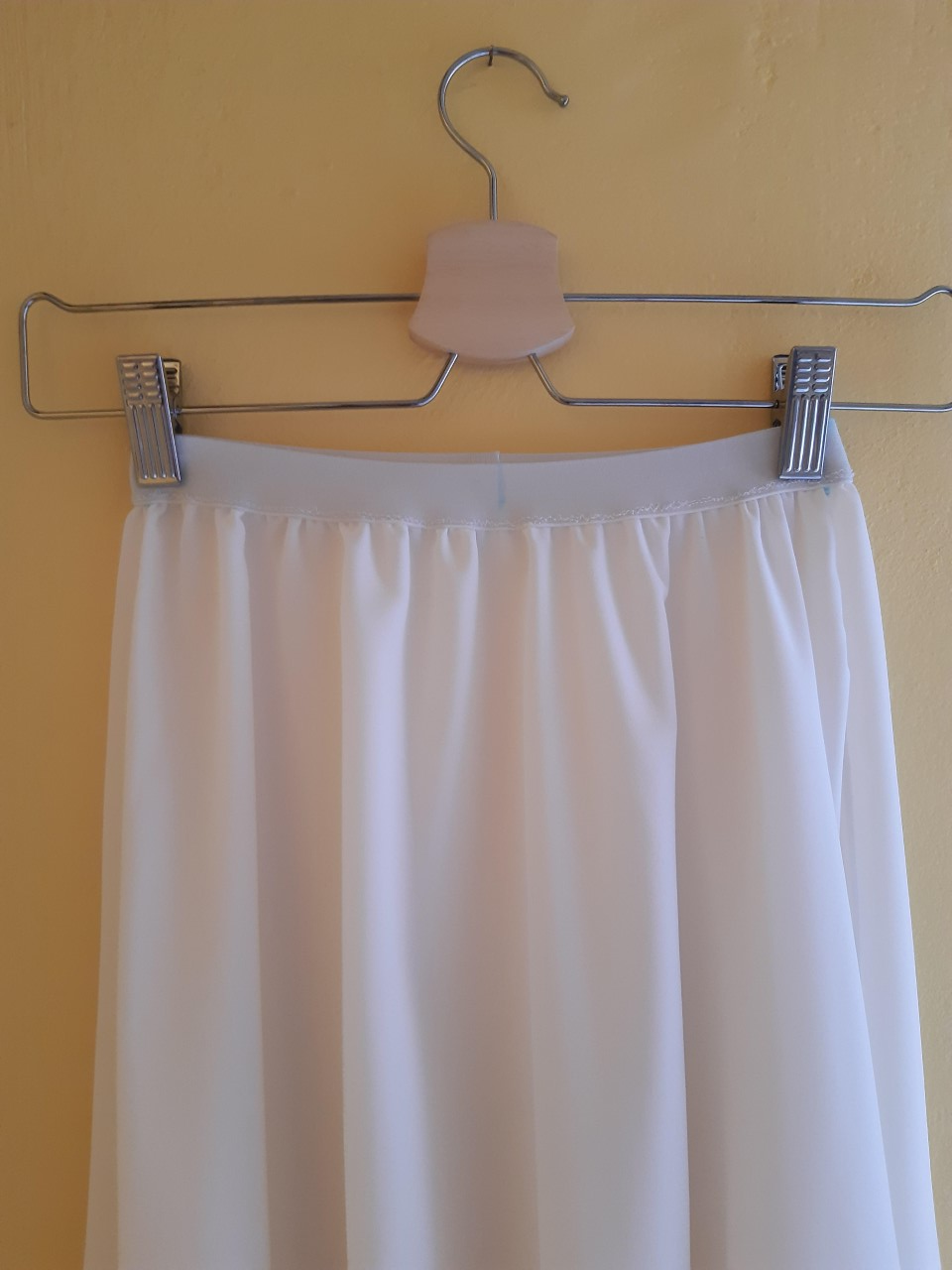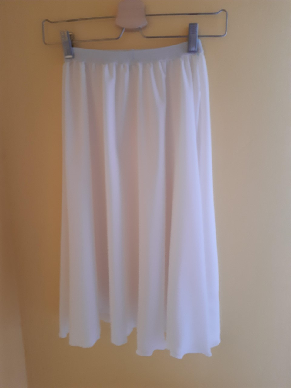 Beautiful, white chiffon skirt for rehearsals and class. Full circular with choice of white or black elastic waist band.