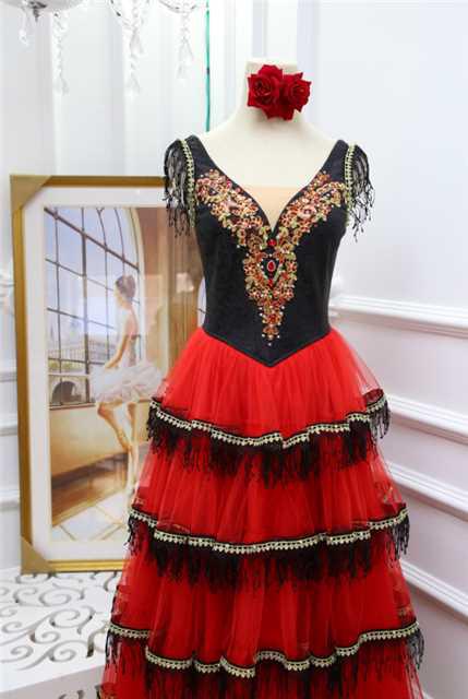 This stunning professional stage costume has been created for roles such as Kitri in Don Quixote, Mercedes or Kitri's friends. it can also be used for the ballet Paquita, Spanish dance in Nutcracker, and for many other classical variations.