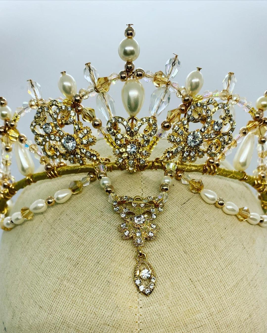 The frame is created with gold metal and it features multiple rows of Swarovski crystals, pearls and stones. It matches perfectly any tutu and can also be used for other variations.