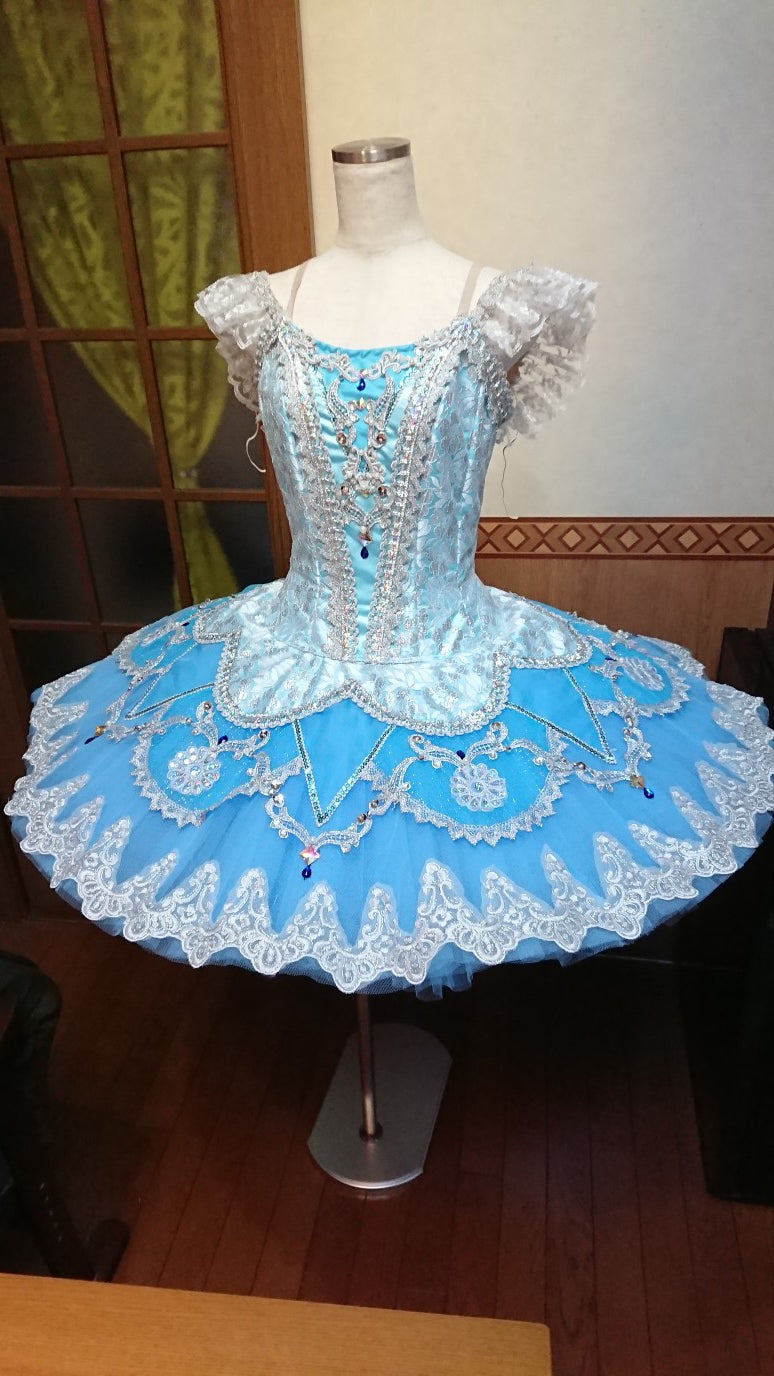 The bell-shaped tutu is more than a masterpiece. Made of ten layers of high quality sky blue net, it features a brocade tutu skirt, silver appliques, lace, silver trims and crystals.