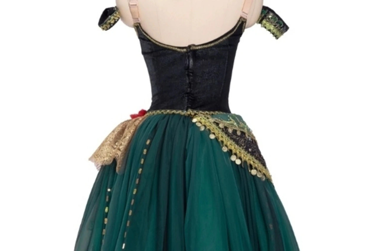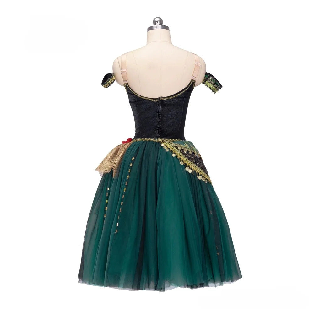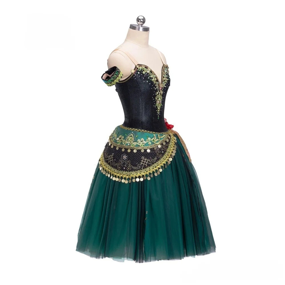 The Romantic length tutu skirt is the highlight of this tutu. Made with high quality deep green and black chiffon and tulle, it features a dark green, red and black scarf decorated with gold appliques and golden coins.