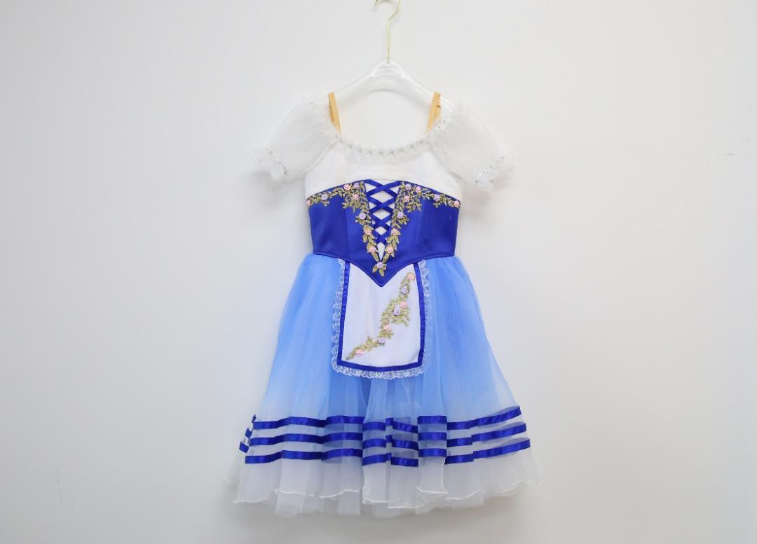 The tulle Romantic skirt has been hand dyed with gradient shades of blue, plus decorated with a little apron and blue silk pink ribbons on the edges of the costume.