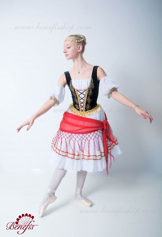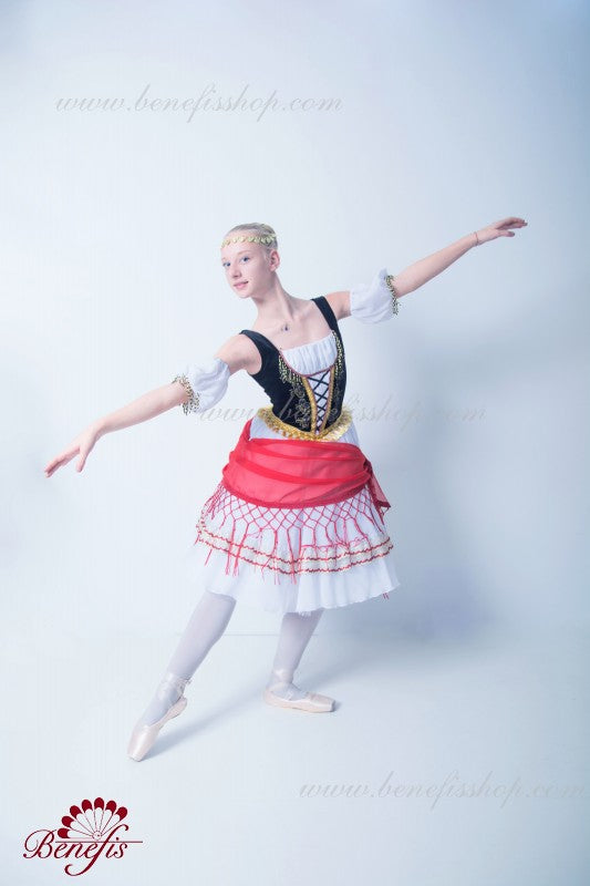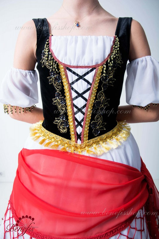 This professional ballet costume is made on the basis of basic, romantic T0003 tutu. The top layer of the skirt is made of chiffon trimmed with two rows of lace. The bodice with shoulder seams is made of semi-stretchy fabric, with decorative chiffon inserts in front. The bodice fastens in the back with 2 rows of hooks and eyes. As a decor we have used applications, braids and pendants. The shawl is made of chiffon fringes.