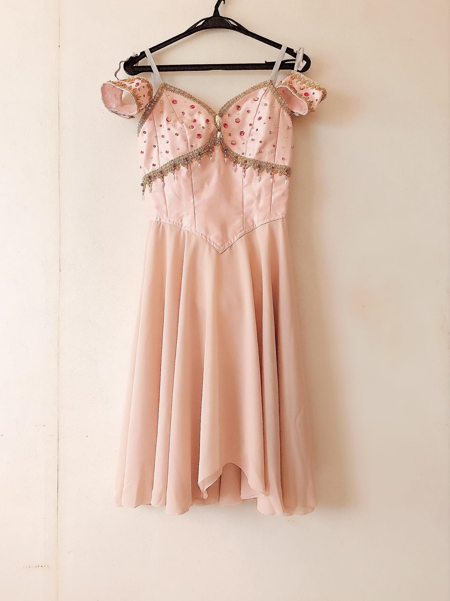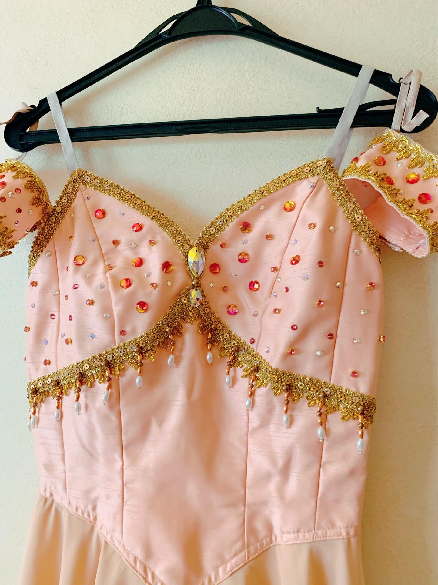 The top of the dress fastens in the back with a double row of hooks and eyes, and is made with pale pink chiffon. The bodice is decorated with golden trims, sequins and Swarovski crystals. Decorated arm bands included.
