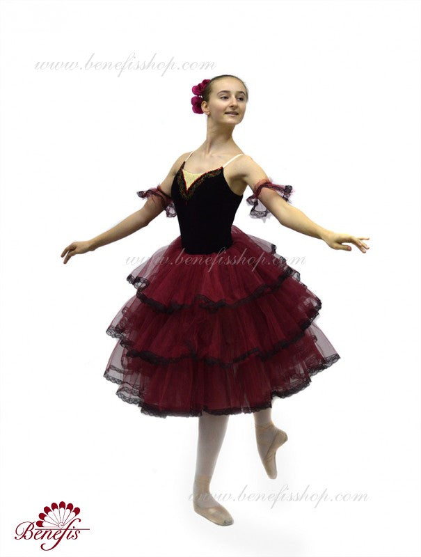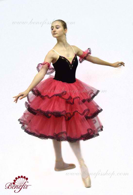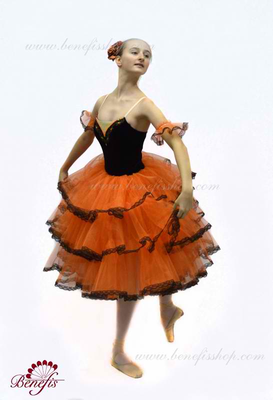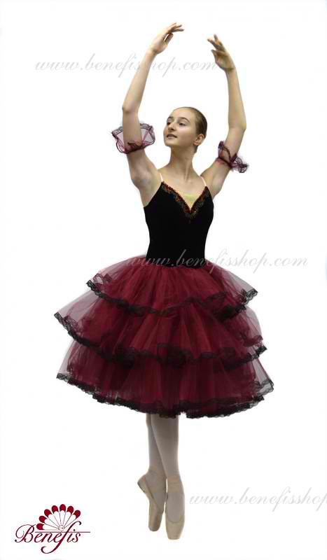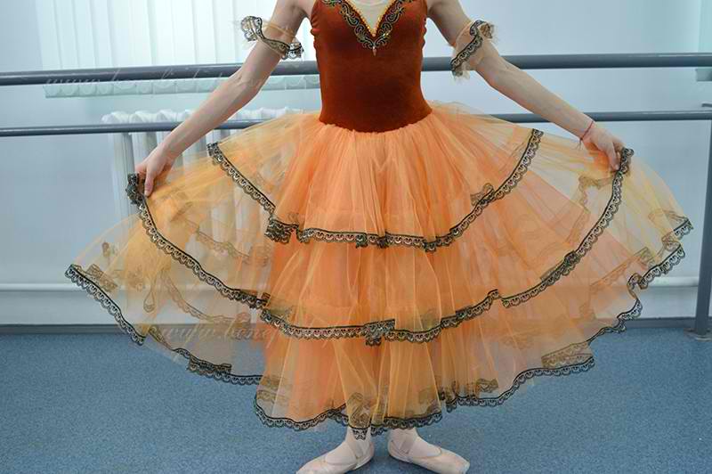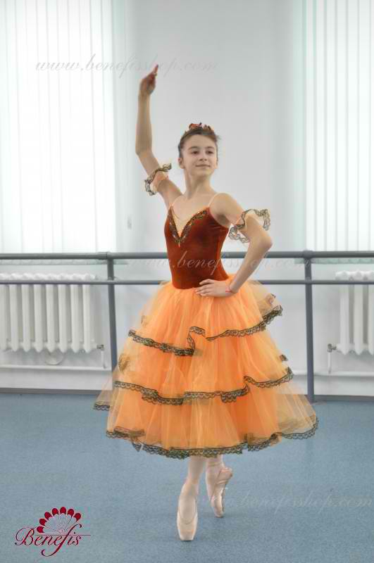 Professional stage costume is made on the basis of leotard. The leotard is made of elastic fabric with V-shaped nude insert. A skirt made of soft and hard tulle. The top layer is made of three flutes treated on the edge of the braid. As a decor are used, appliqués, sequins, and rhinestones.