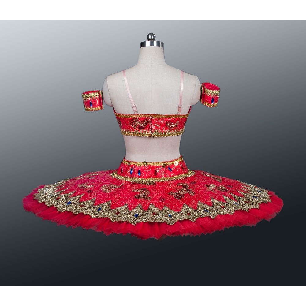 This unique stage costume has been designed for "La Bayadere" or for the Odalisques from "Le Corsaire". The bodice is short-cut, elegantly decorated in gold with beads and sequins. The top layer of the skirt is embellished with gold trims, stones, beads and sequins. The oriental look of the costume is completed by two decorated arm bands.