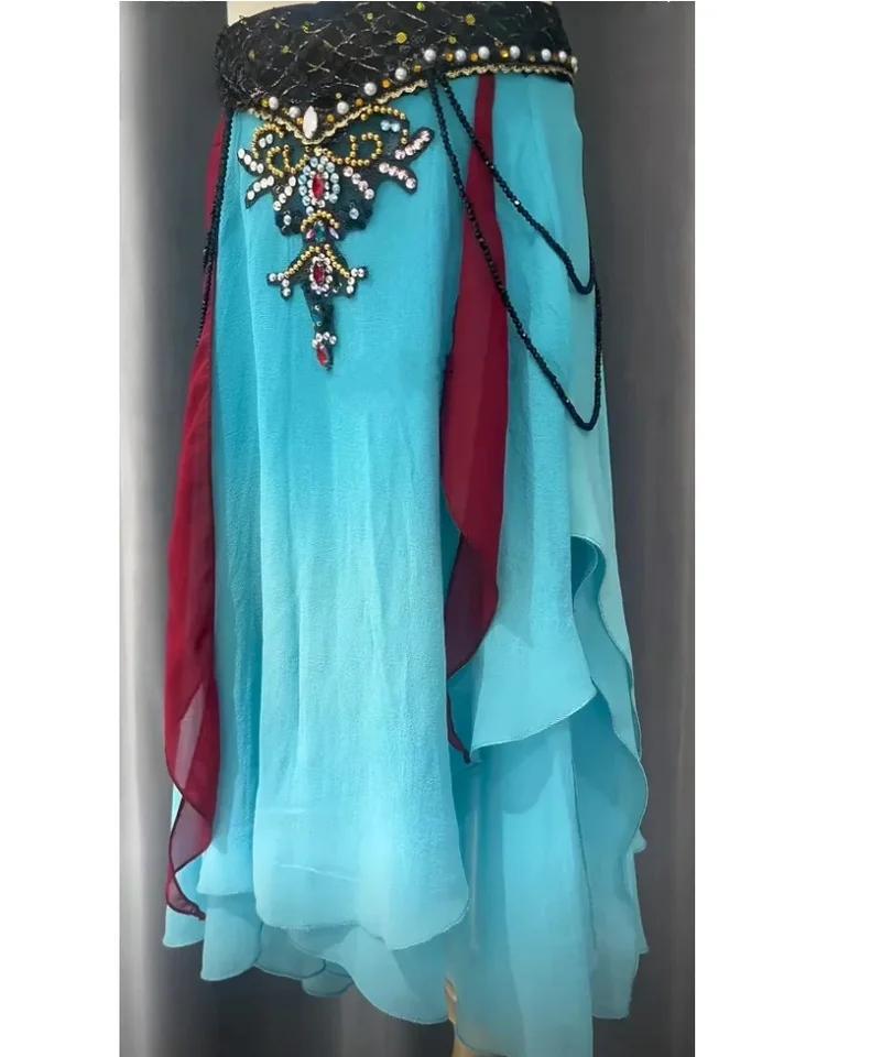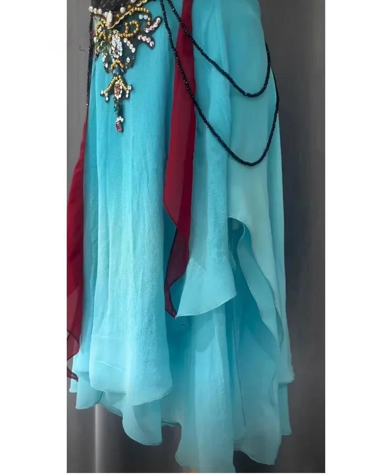 The mid-calf length blue chiffon skirt has an embroidered black belt, and various burgundy chiffon scarves attached. The lengths of the skirt are uneven.