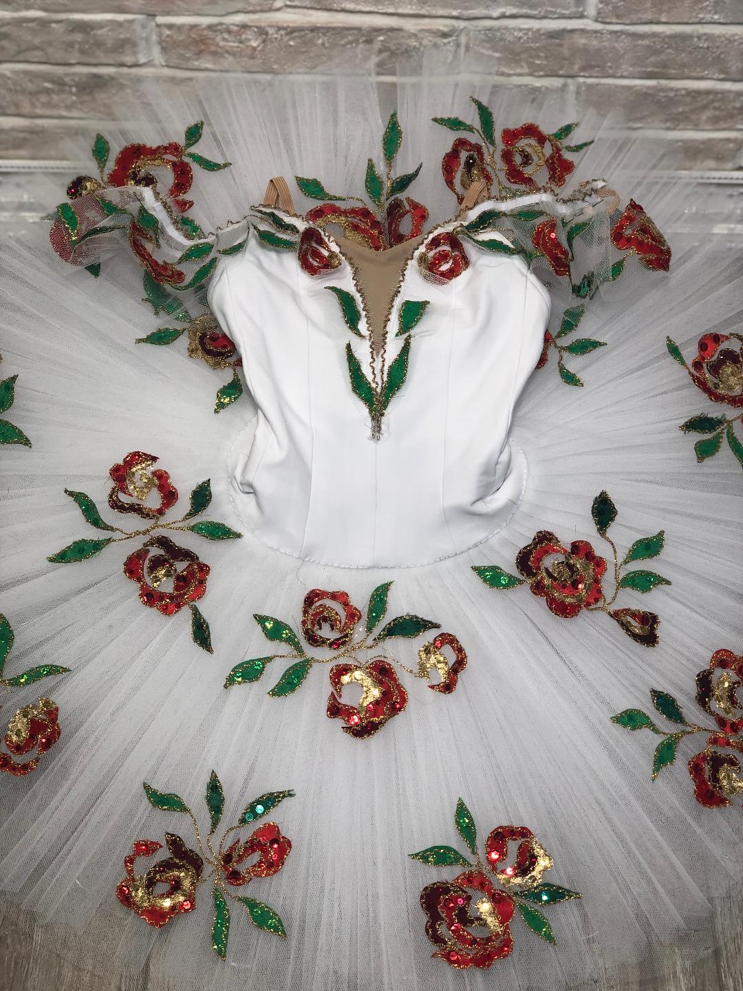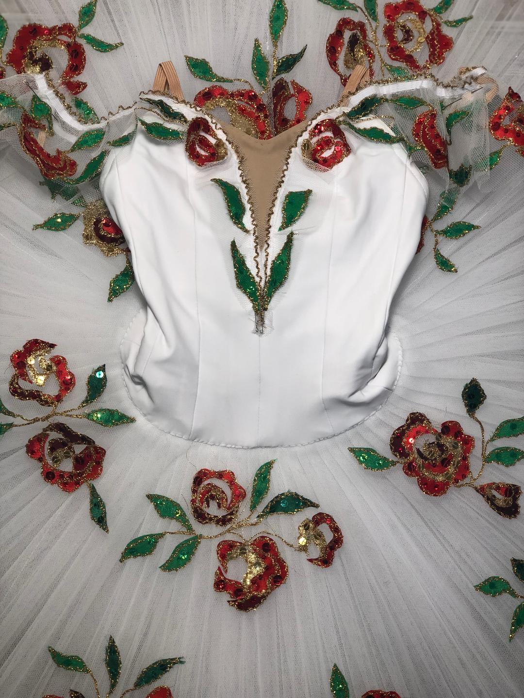 The bodice and the cap sleeves are decorated with red flowers and green leaves appliques. God, green and red sparkles are also sewn on the bodice and skirt.