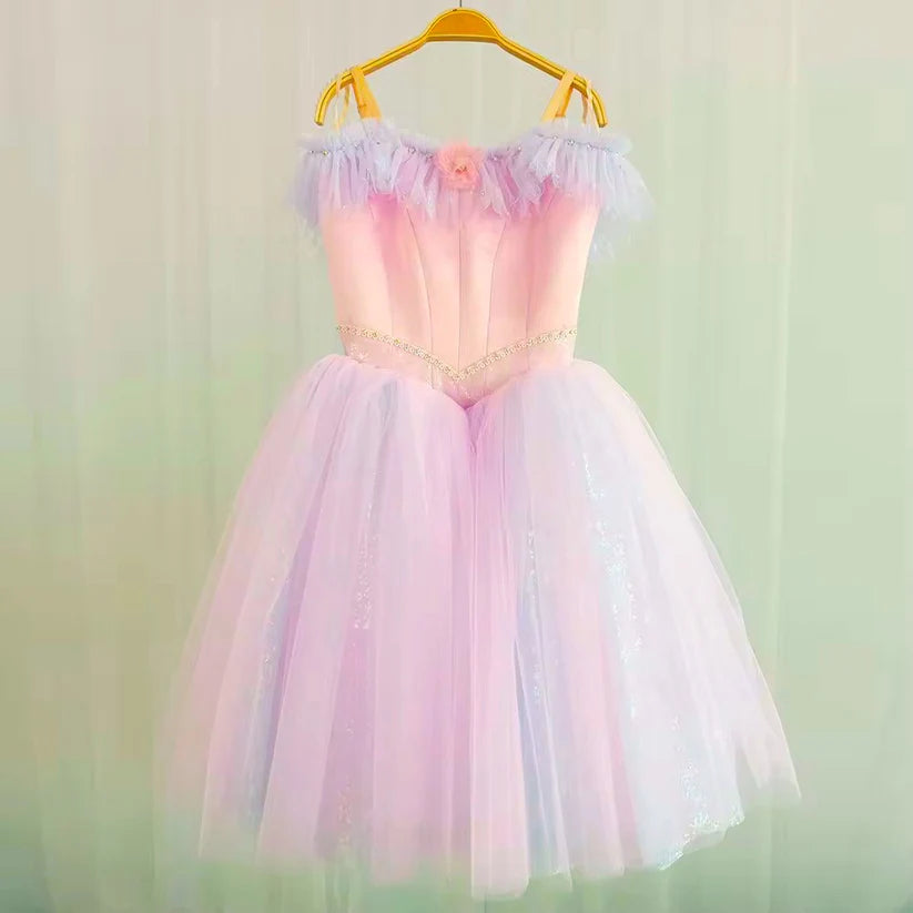 The Romantic length tutu skirt is created with different pastel shades of glittery tulle: lilac, pink, pale blue and white.