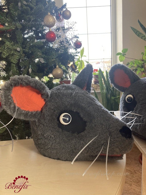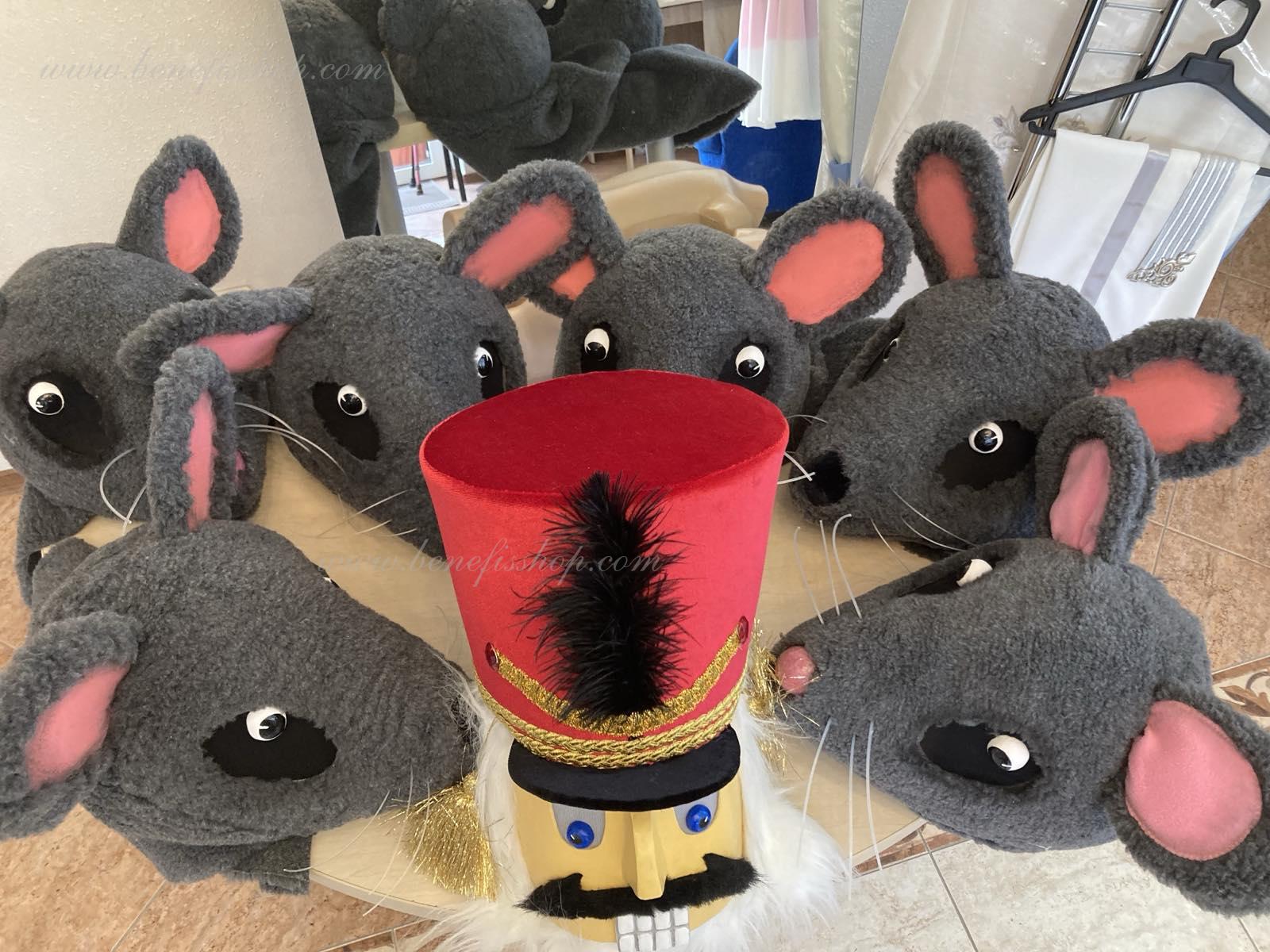 Fur mask. This beautiful Nutcracker mouse headdress is made of papier-mâché, covered with fur, the eyes are cut out so conveniently that the actor can freely see the stage from the inside during the dance. This mask has a special fastening system inside so that the mask stays well on the dancer's head.