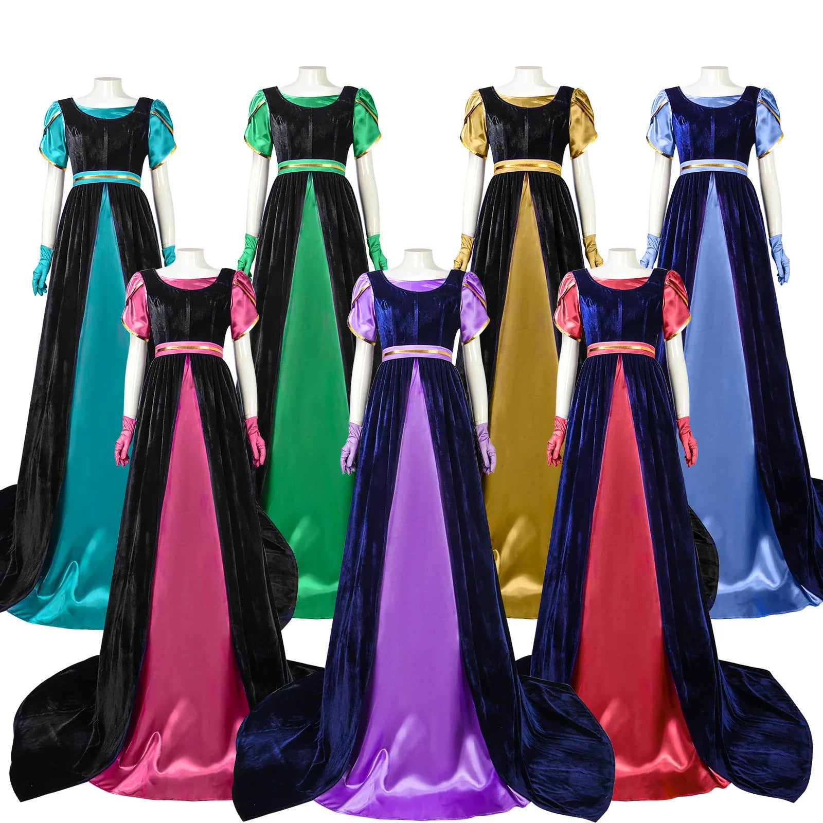 This long dress is made with light velvet and features a satin under dress, matching short sleeves, belt and gloves.