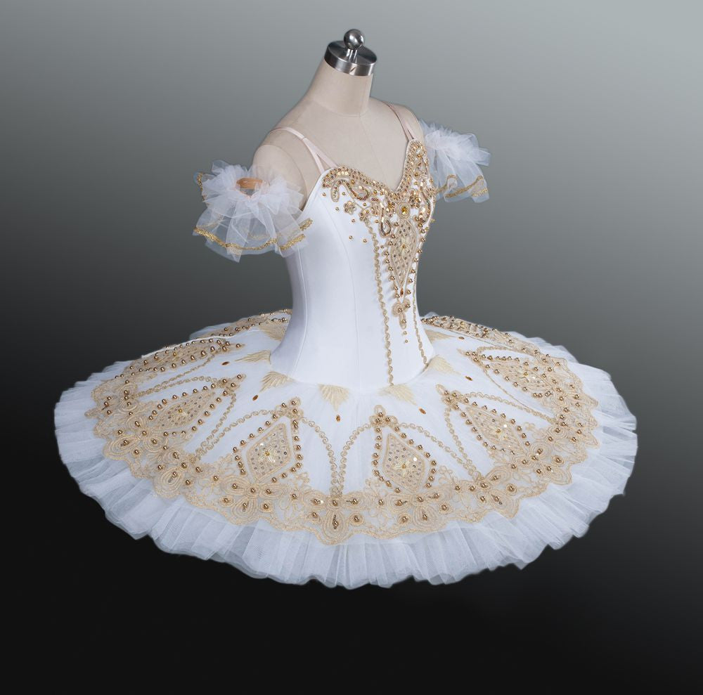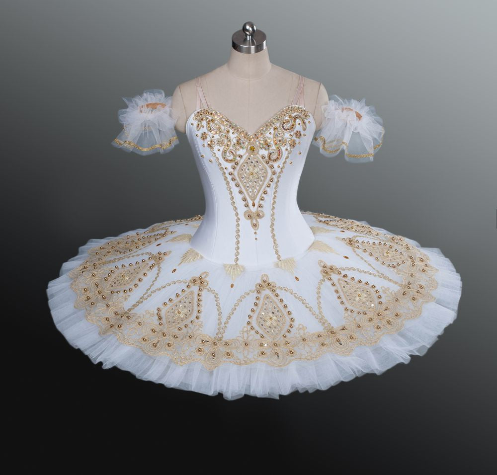 Feminine, enchanting.... it is a triumph of white and gold... any dancer wearing this costume will look like a true princess.