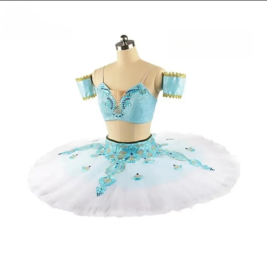 The pancake, ten layers tutu skirt features some gradient shades of very pale turquoise, an embroidered waist band, and very rich turquoise appliques and blue crystals.