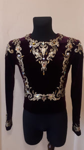 This tunic is made with high quality velvet, in a wonderful dark shade of plum color. It features a round neck, straight sleeves, and it fastens in the back with a double row of hooks and eyes.