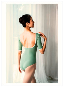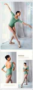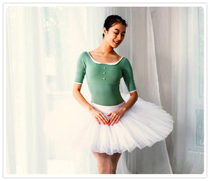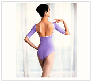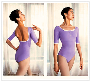 This charming three quarter sleeves leotard features a a front boat neck and a deep square back. Lovely white decoration front and back and on the sleeves. Three cute white buttons decorate the front of the leotard.