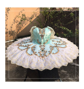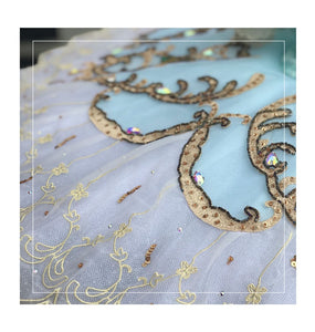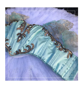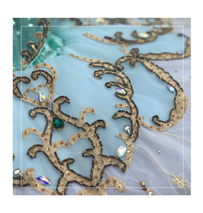 The V-shaped bodice of this professional tutu is made with silk shiny satin in a wonderful shade of aqua green. The decorations are extremely rich. We have used gold appliques, golden and black small crystals, silver trims and crystal diamonds. There is a long V cut in the front, and a nude insert. Ivory lace sleeves are attached to the spaghetti straps.