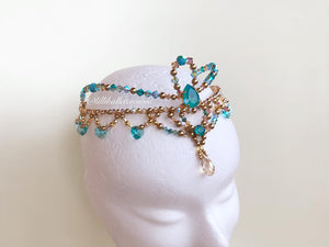 Built on a golden frame, decorated with turquoise Swarovski crystals, golden pearls, and boasting a dramatic white crystal as a front drop.