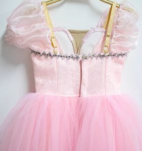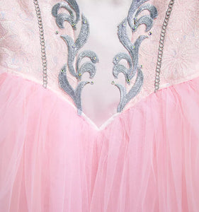 "Assoluta" is the perfect tutu for any type of ballet. Semi-stretchy fabric with lace inserts, V neck bodice with low square back and thin spaghetti straps. Hooks and eyes closure in the back. Silver decorations with appliques, trims and pearls matching the costume color.