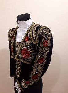 The black, main part of the jacket, as well as the long sleeves, are made with black high quality fabric, and is very richly decorated with gold appliques and red and clear crystals and stones,beads and sequins.