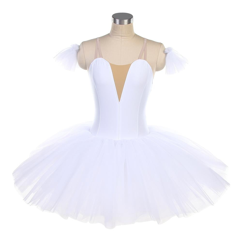 Professional white, bell-shaped tutu. Semi-stretchy white bodice with deep nude insert and hooks and eyes closure. White arm bands.