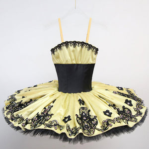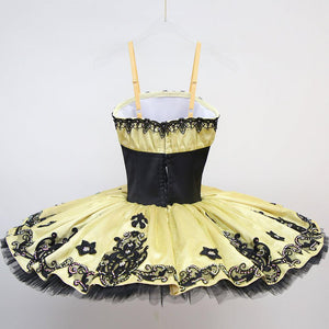 The 10 layers pancake tutu skirt is topped by a very elegant gold overlay and rich black appliques and lace.