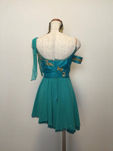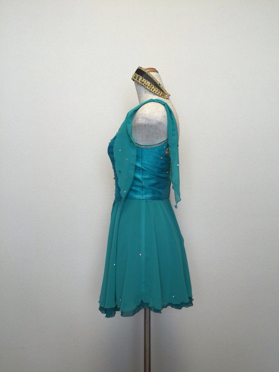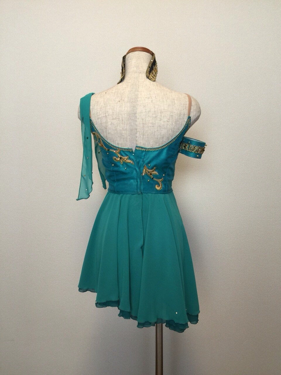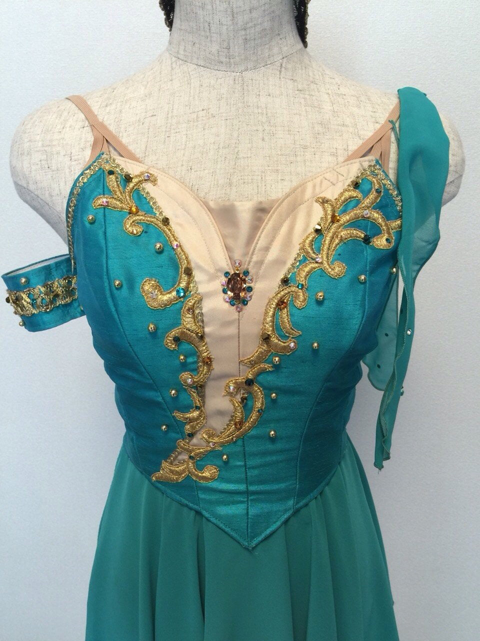 The bodice is created with silk taffetas in an incredible shade of ocean blue/green, and decorated with gold appliques and Swarovski crystals. It feature a deep nude insert, which is also embellished with crystals. There is a small chiffon scarf attached to one of the clear strap, while on the other side we have created a matching arm bracelet.