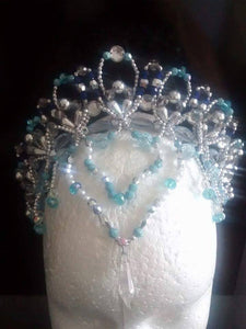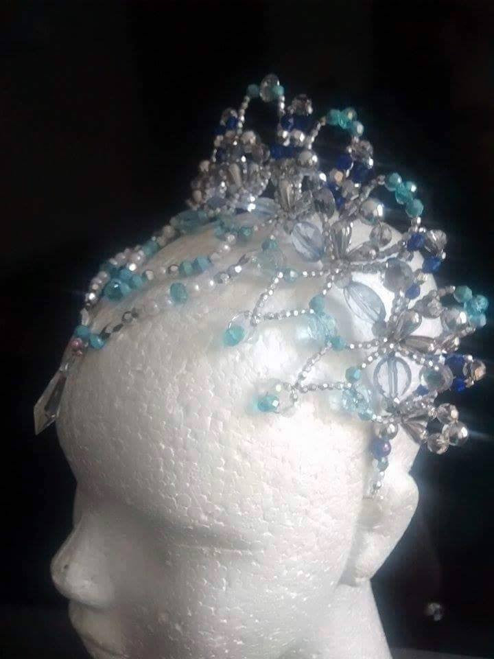 It features a crown like tiara with stunning blue crystals and beads, as well as a drop down with a central drop. For this tiara we have used blue stones of different shapes and size, and lighter blue beads.