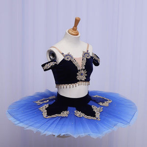 The pancake, 10 layers tutu skirt is pale blue, featuring an overlay of deep blue tulle decorated with clear sparkles, and a dark blue, velvet tutu skirt shaped as a flower. Rich gold appliques and blue crystals embellish the tutu skirt.