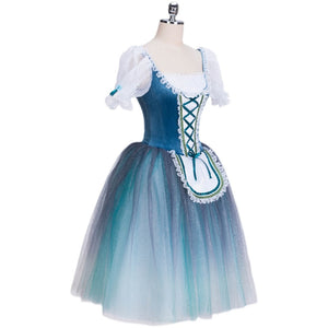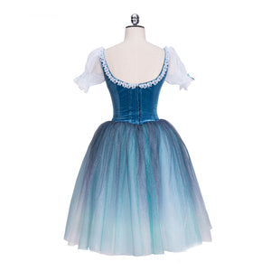This Romantic tutu features a deep blue velvet bodice with a white undershirt, blue laced pattern, and puffy white short sleeves.