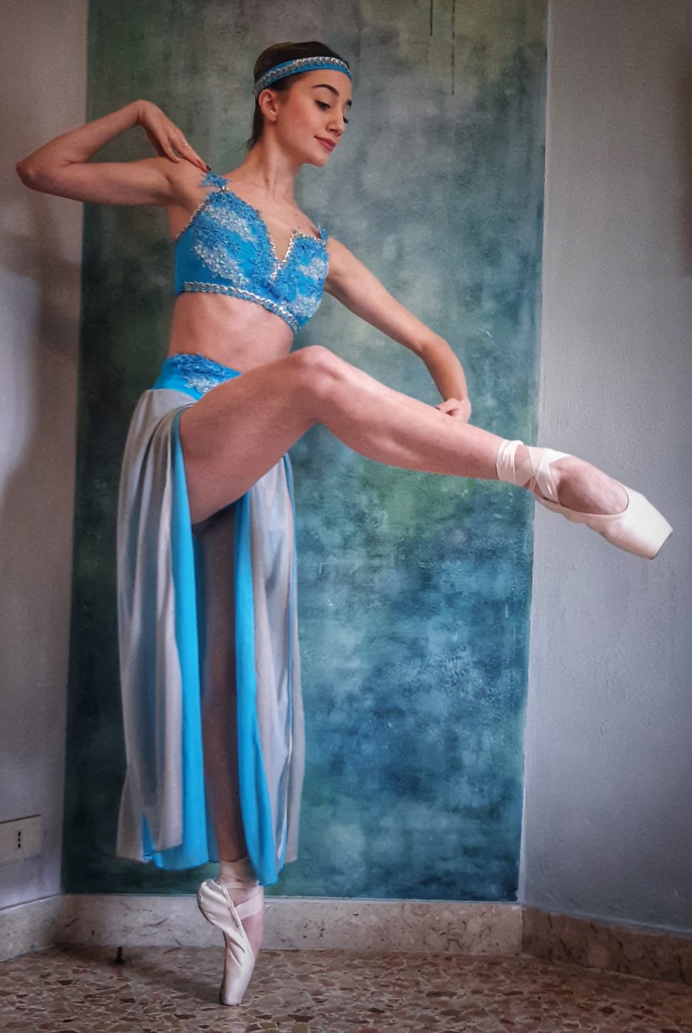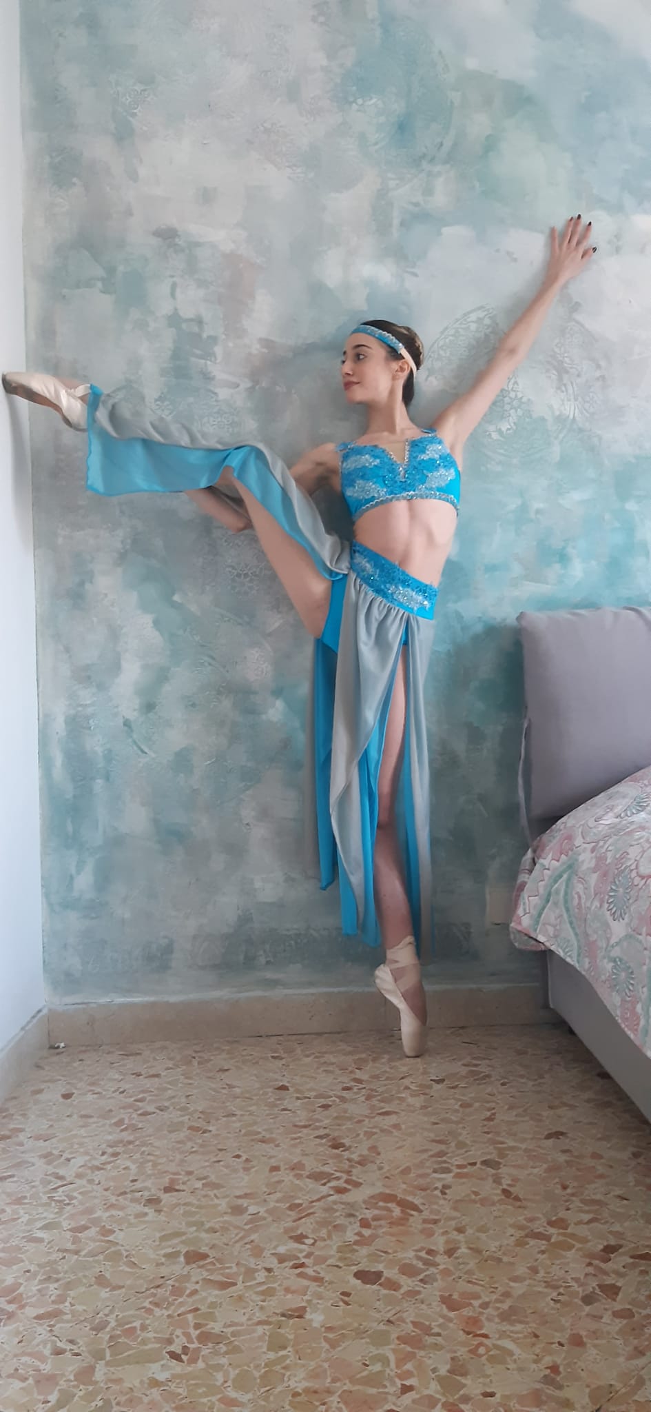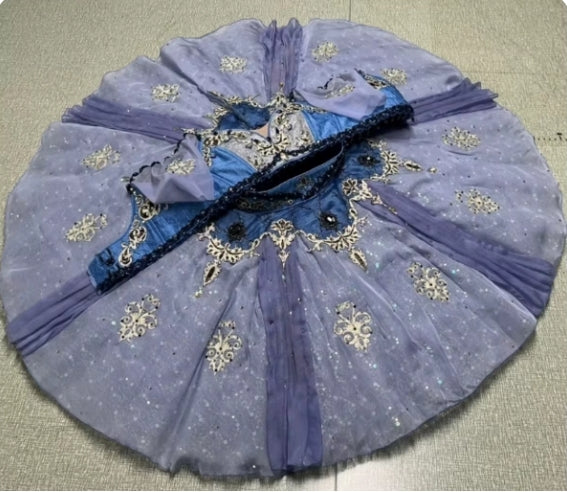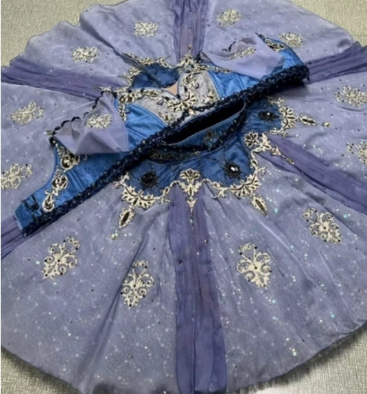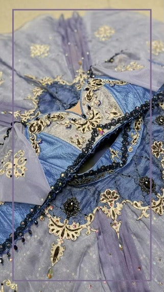 This stage costume features a short, deep blue top entirely embroidered with gold shiny appliques and embellishments. The platter, 12 layers tutu skirt is made with ombre' dyed blue tulle, and features a top layer made with glittery tulle. Decorated with gold appliques as the top