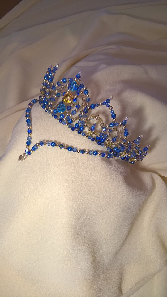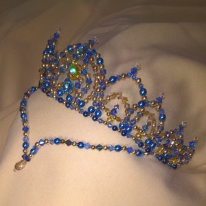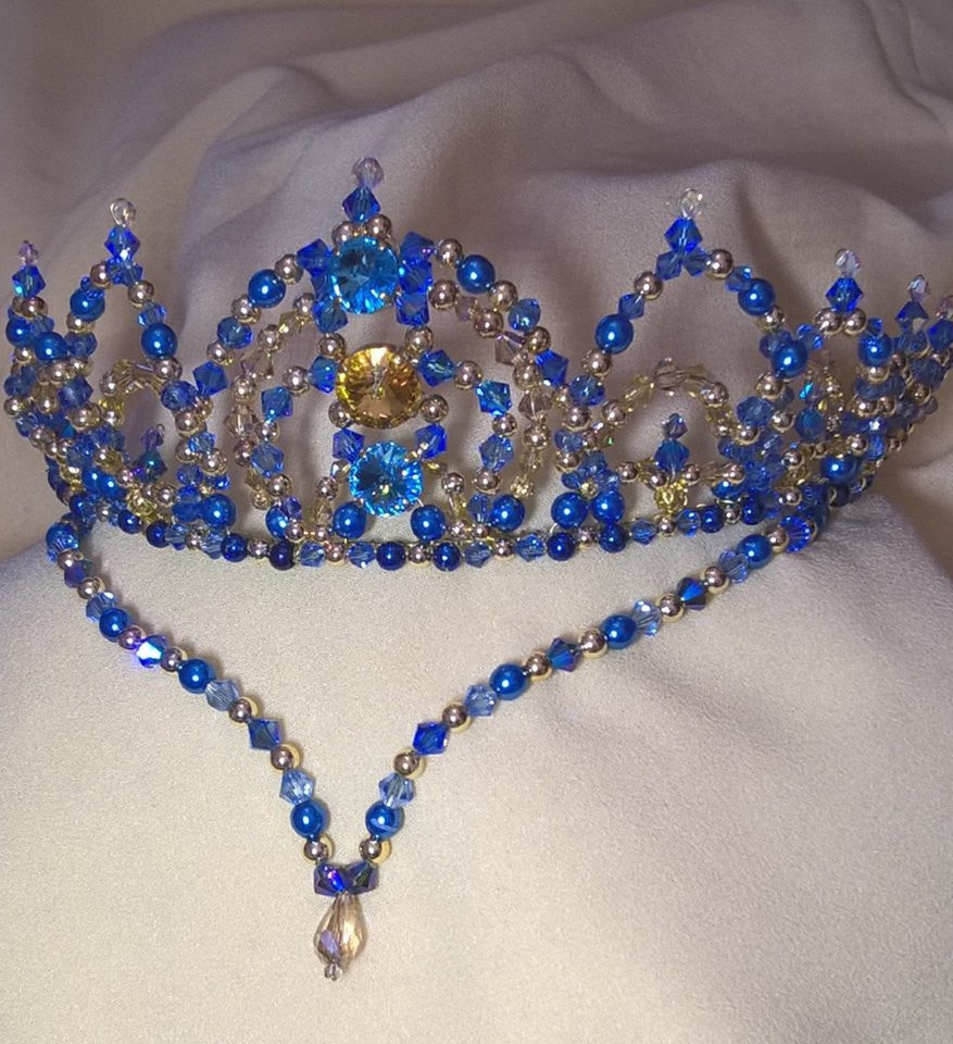 This crown-type tiara is inspired by Florina and uses silver pearls and blue Swarovski crystals.