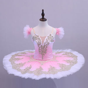 The professional 10 layers platter skirt is also pink, and features rich embellishments with gold appliques and sparkles.