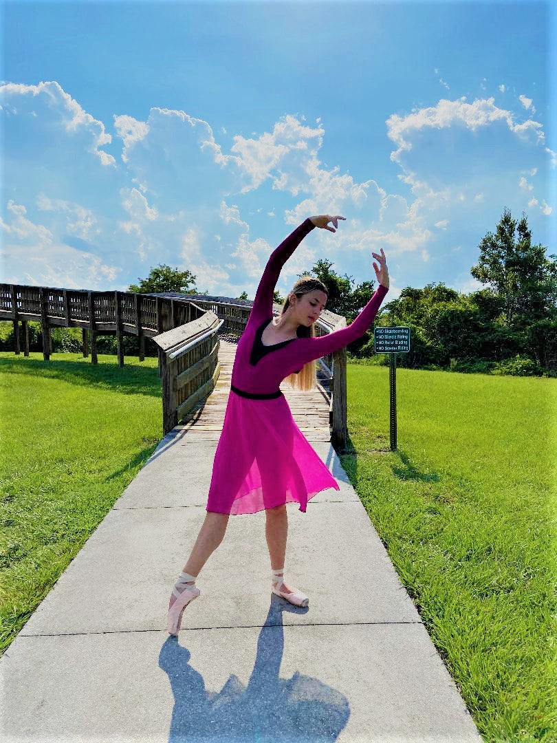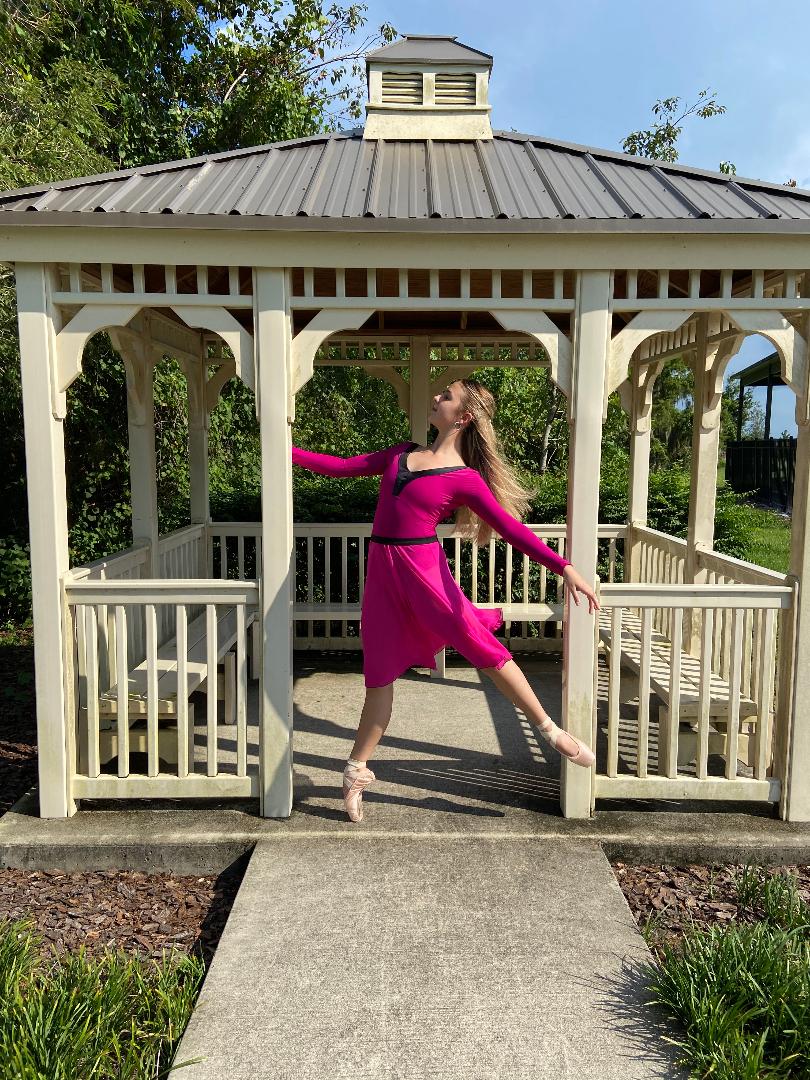In the picture our Dance Ambassador Alexis Workowski is wearing "California Sunset" in fuchsia and black, with "Wild Raspberry" chiffon rehearsal skit.