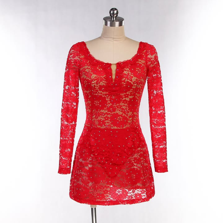 A delightful stage costume for the role of Carmen, made by a famous Italian tutu maker. Bright red high quality lycra bodice with thin red straps, decorated with red lace which creates a tiny skirt. Embellishments made with black trims.