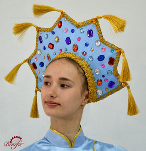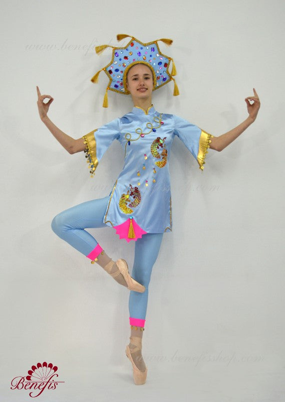 Details: tunic, tights, headpiece. This is a professional stage costume. The tunic is made of semi-stretched fabric, with cuts on the sides. Clasp behind the zipper. As decoration we have used appliques, braid, sequins, coins, rhinestones. Tights are made of elastic fabric supplex, and decorated with coins at the bottom.