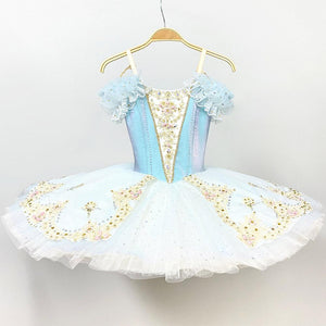 The slightly bell shaped tutu skirt is white, with a pale blue overlay, and features very rich decoration with appliques, beads and crystals.
